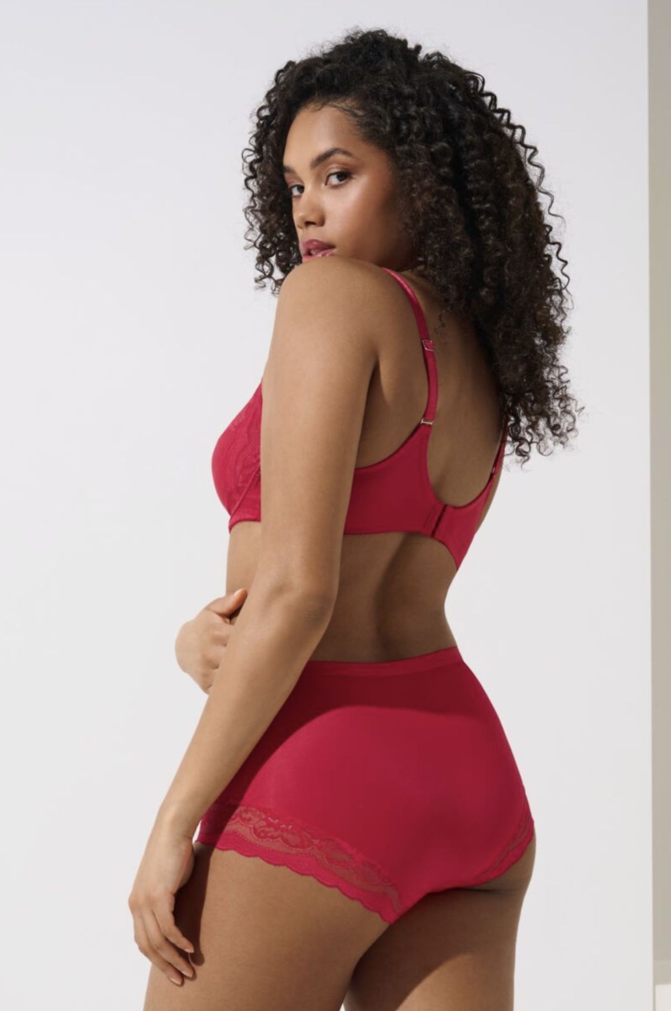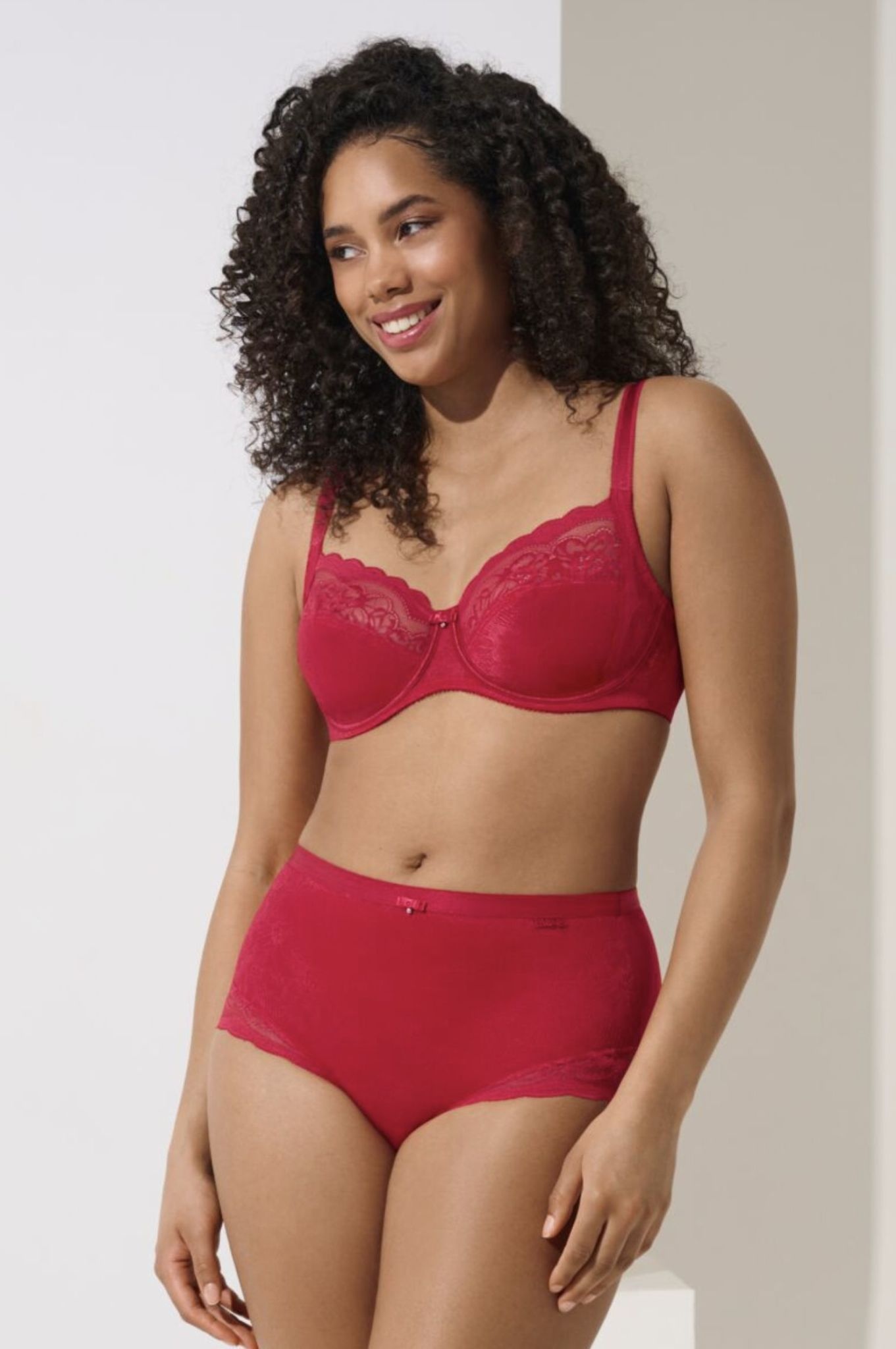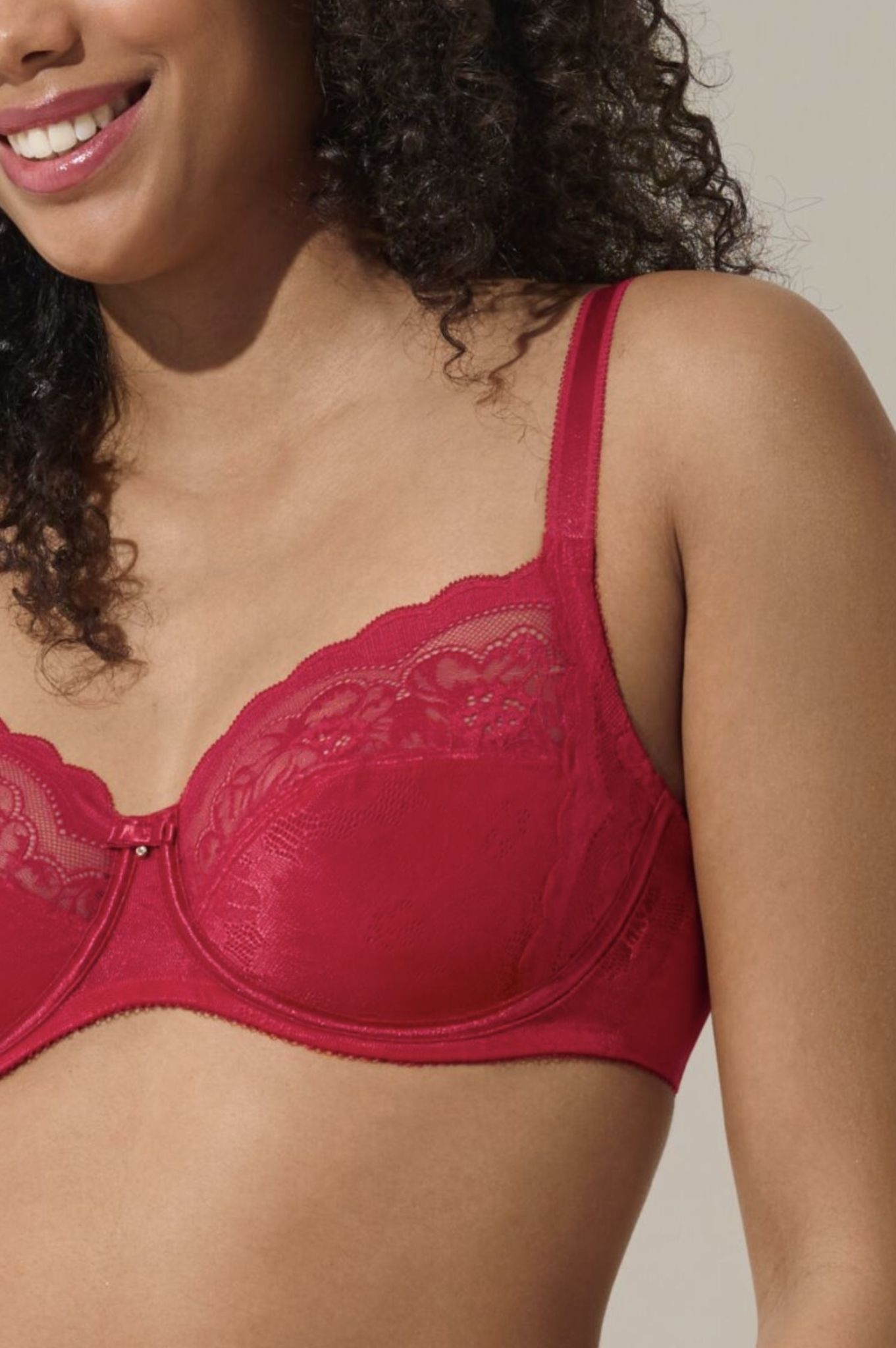 Elegante en romantische lingerie. Deze bh met beugel heeft genaaide cups die zorgen voor een perfecte pasvorm, zelfs bij grotere cups. Hoewel het voorste deel van de bh volledig gemaakt is van elastisch kant, zorgt de snit voor een optimale ondersteuning van de buste.