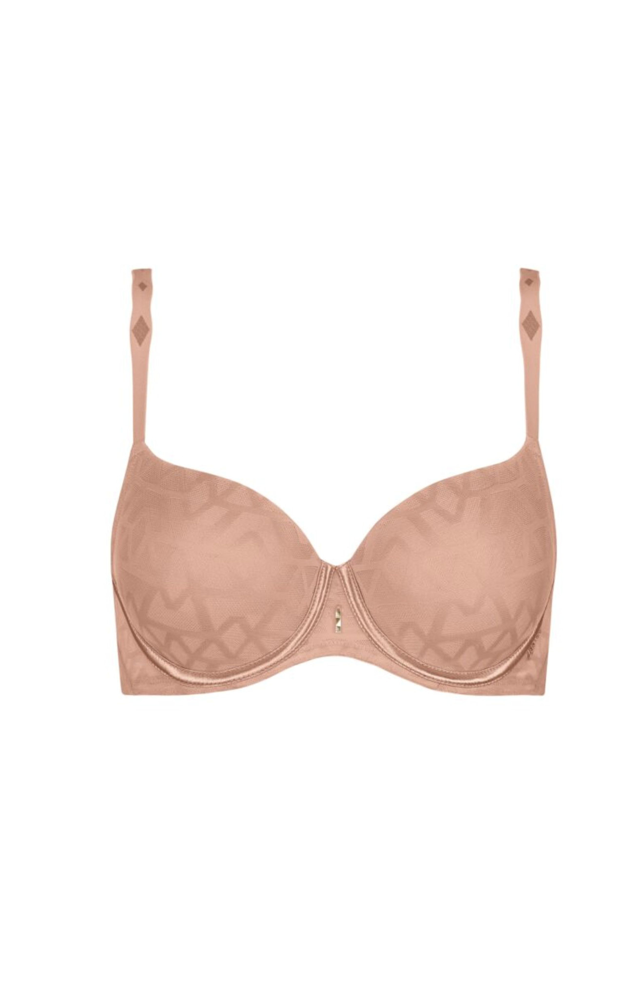 - Naadloze cups, bedekt met elastisch kant met een grafisch patroon