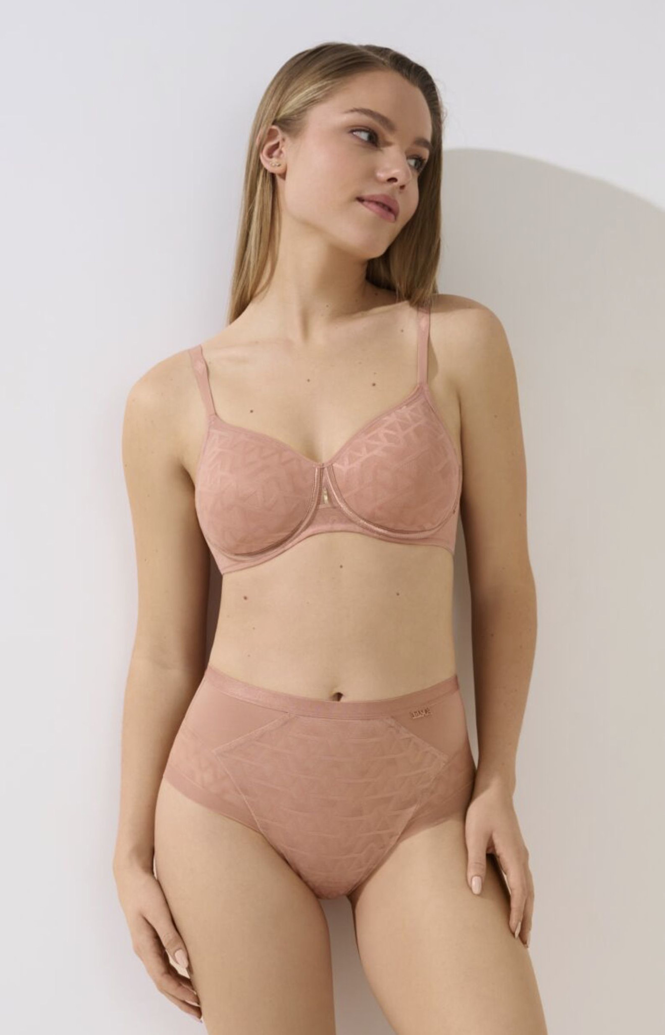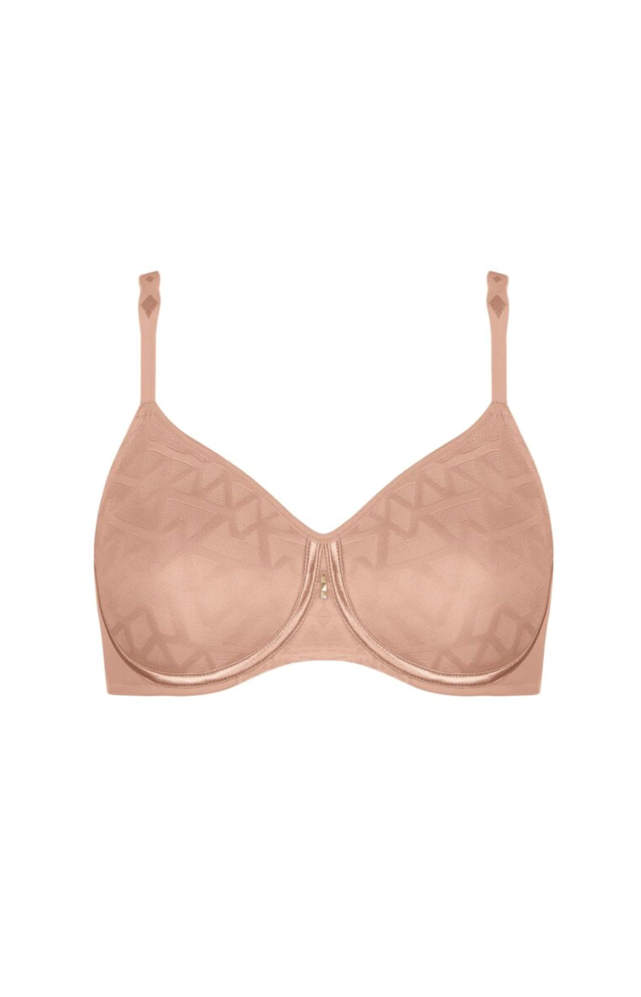 - Naadloze cups, bedekt met elastisch kant met een grafisch patroon