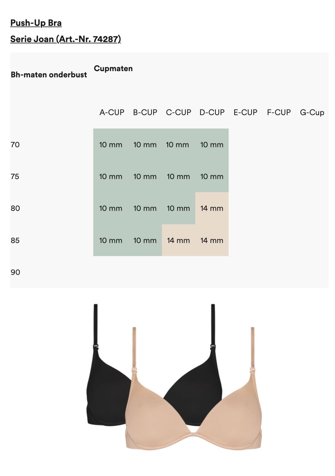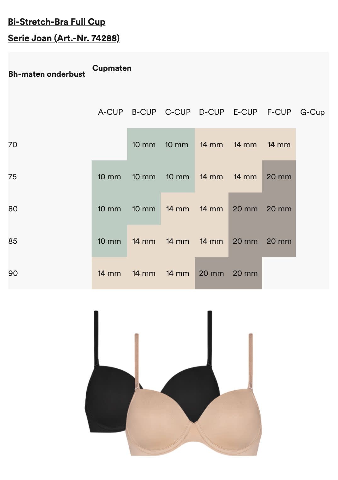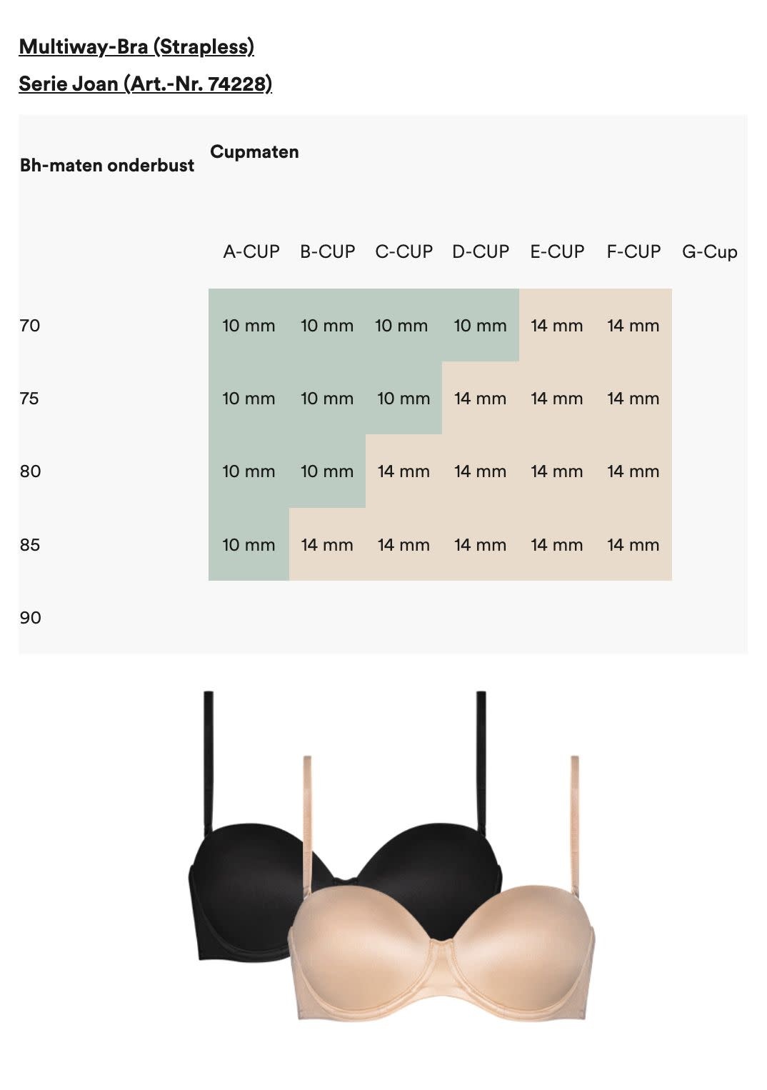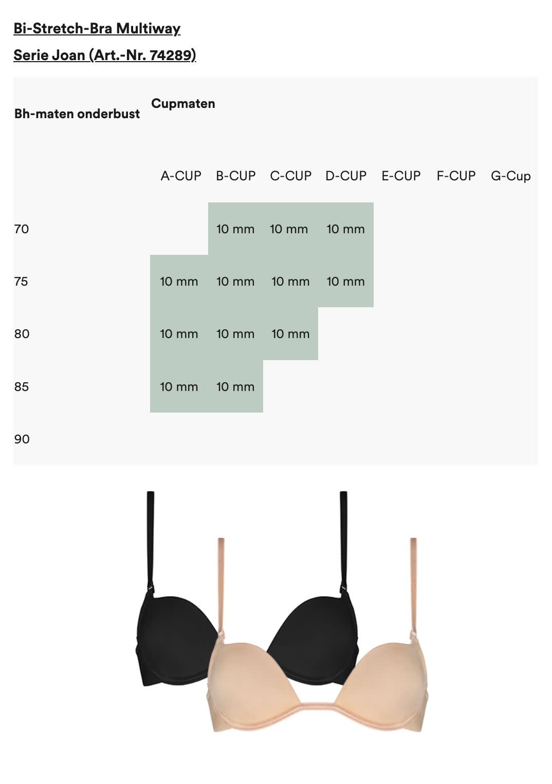Op deze pagina vind je het bijpassende bandje voor jouw bh. Raadpleeg de tabellen in de foto's om de juiste bandbreedte voor jou te vinden. Omdat elke bh een andere snit en pasvorm heeft, kan de breedte van het bandje variëren afhankelijk van je cupmaat en het bh-model in kwestie.