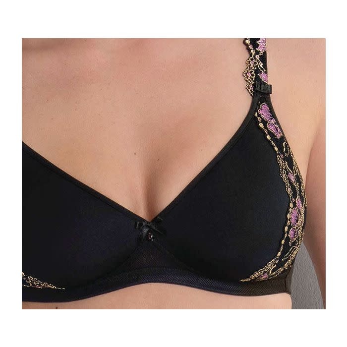 Vive la femme: de Colette triangelbeha zonder beugels laat zich van haar verleidelijke kant zien met een bijzonder laag uitgesneden decolleté. De zachte beha met ademende spacer cups pakt uit met adembenemend, driekleurig bloemenkant in de vorm van een halve maan aan de zijkant van de cup en op de bandjes.