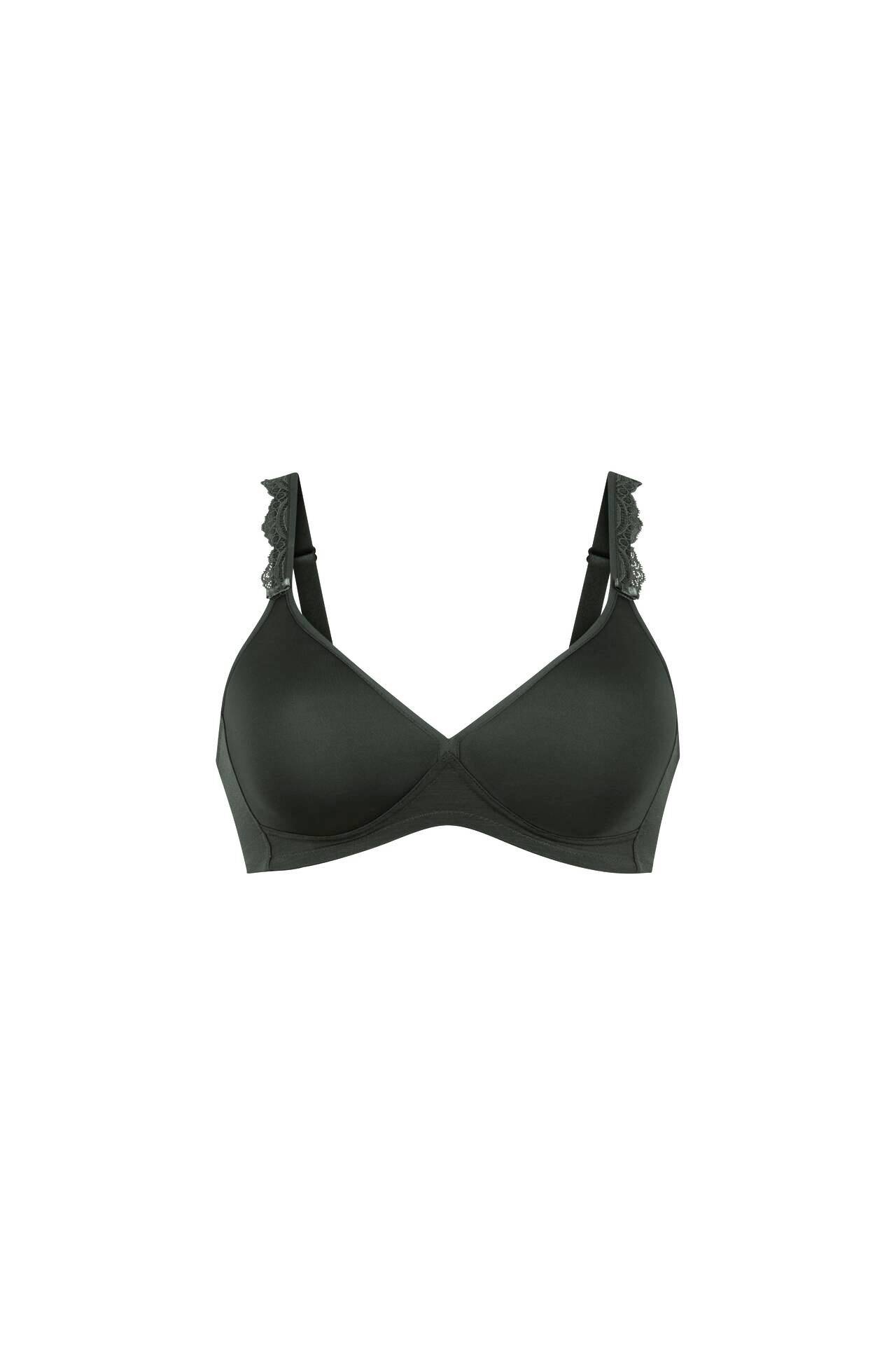 Vrouwelijk en relaxed De nieuwe triangelvormige softbeha met spacercups combineert een sierlijke lingerielook met een ontspannen draaggevoel. Heldere, fijn gebogen lijnen omlijsten een diep decolleté, de schouderbandjes zijn versierd met zacht kantgallon.Met zijn ademende, voorgevormde spacercup zonder beugel is hij nauwelijks voelbaar en vormt de beha een extra diep decolleté tot en met cup G.