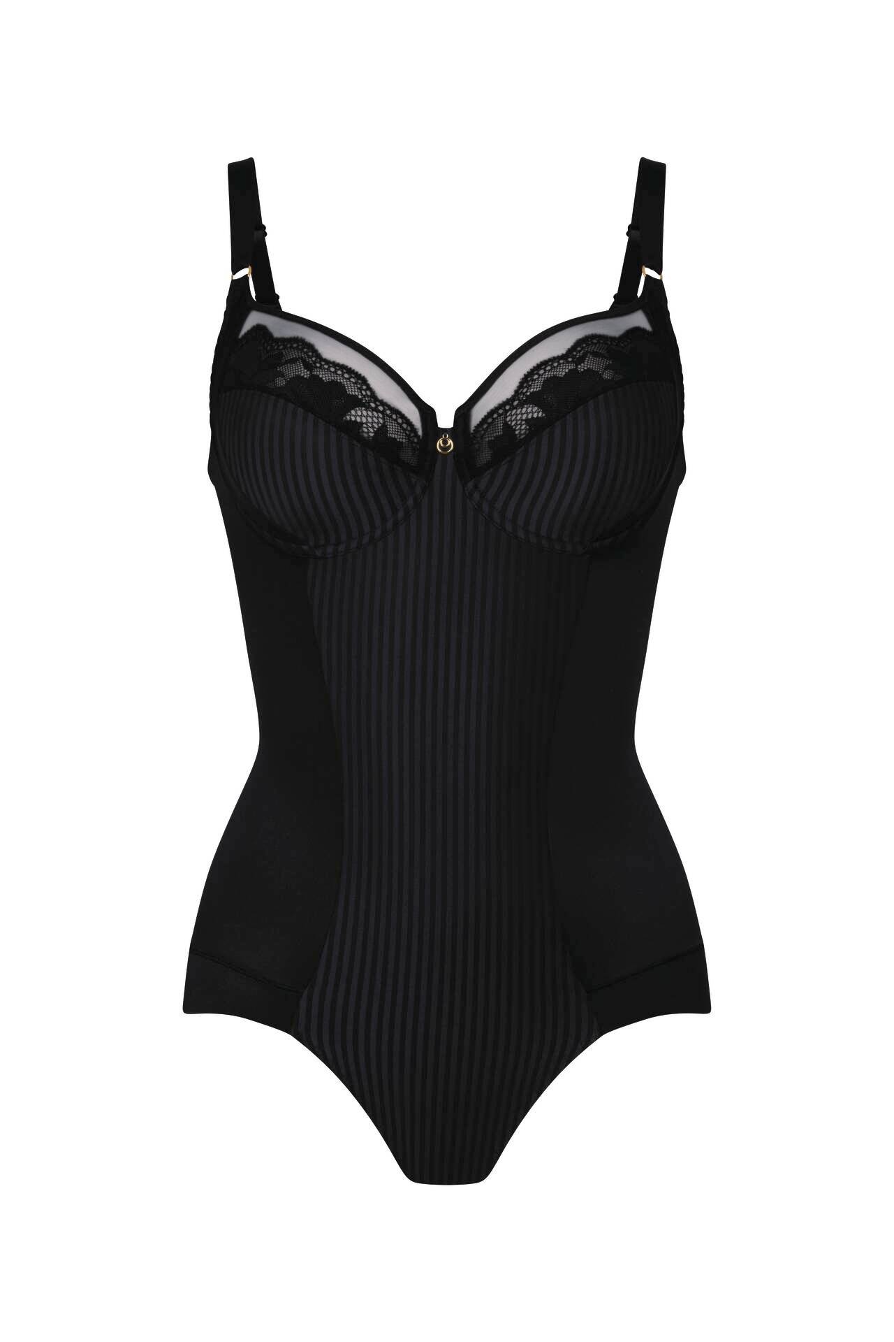 De Sita beugelbody combineert stretchkant, transparante tule en een glamoureus streepdessin voor een vrouwelijke look. De rondom modellerende stof geeft het silhouet zachtjes vorm. Platte beenboorden en charmante details zoals de goudkleurige sierring zorgen voor comfort en elegantie.