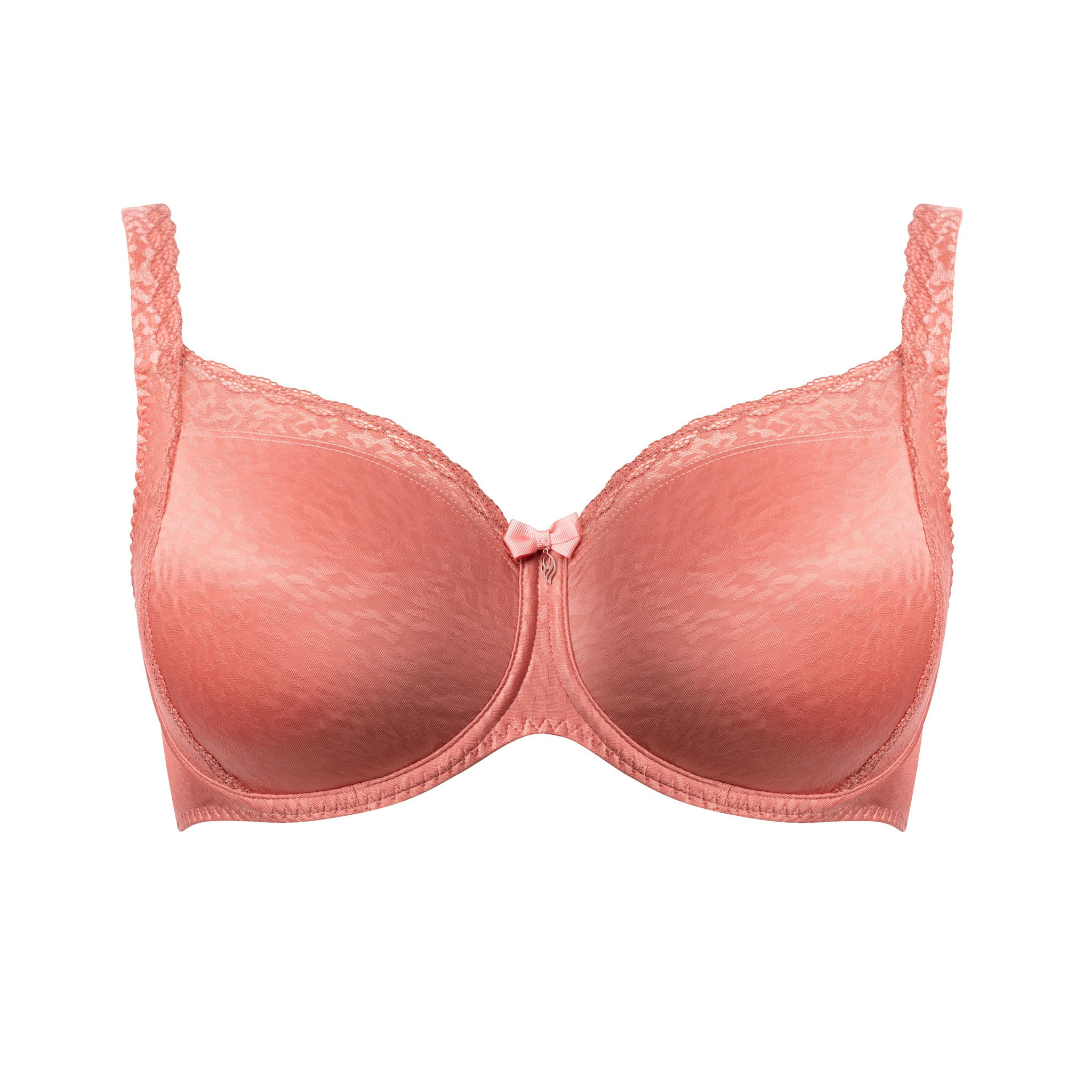 Voorgevormde cup met een kanten zijpaneel dat naadloos doorloopt in de band naar de schouder. Het paneel is gevoerd met stevig tule, dat de buste aan de zijkant goed ondersteunt terwijl het kant licht en transparant blijft.